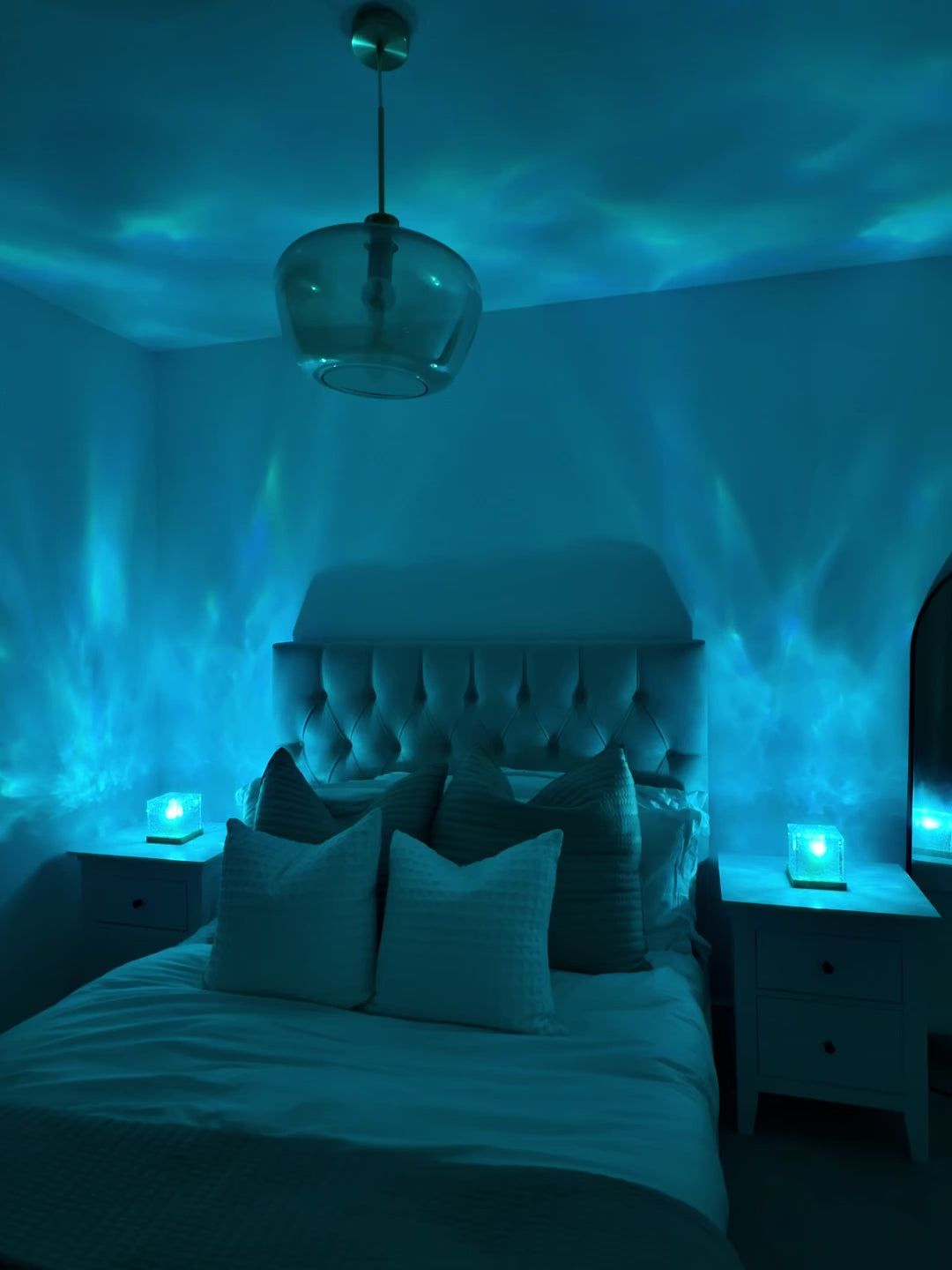 Lampka projektuje kolorowe fale światła tworzące relaksującą atmosferę